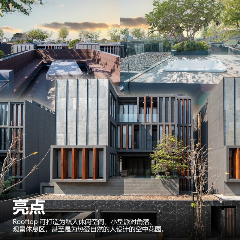 每套别墅均配备可直通泳池的客厅、屋顶露台和私人电梯。