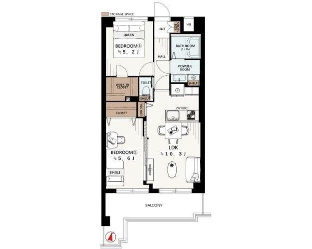 g取り: 2LDK + W (2LDK + W,W 可能代表步入式衣帽间或其他空间)
