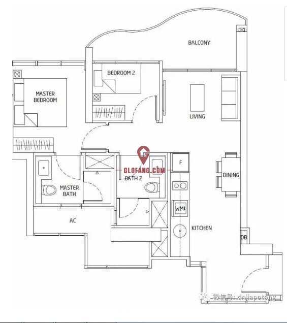 2房户型,72平方米/775平方英尺,开放式厨房,对2房面积来说这户型面积够大,弧线阳台设计,灵感来自天然大理石的花纹.价格新币130.9万起