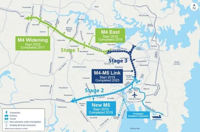 全长33 公里,把悉尼西部,机场和Botany港连接在了一起,这个项目将使Parramatta 至机场可节省40 ,Penrith 到CBD,Strathfield 至机场可节省20 ,该项目将新增10,000 个岗位。