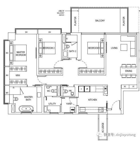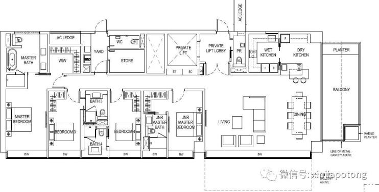3卧室户型,165平方米/1776平方英尺,每个房间足够大,户型方正,价格608.3万新币起