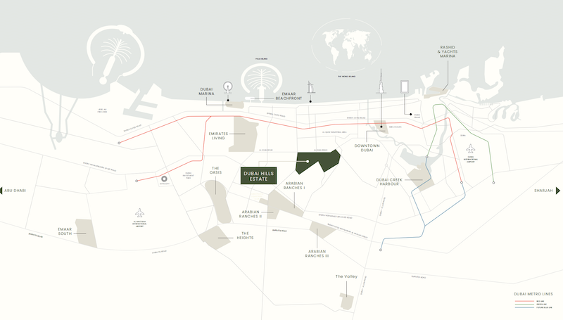 Dubai Hills(迪拜山庄)这个全能的生活社区坐落在迪拜市中心(Downtown Dubai)与迪拜港(Dubai Marina)之间,临近Al Khail Road,驾车即可轻松抵达迪拜市区内外任何一个闻名世界的街区与坐标地!