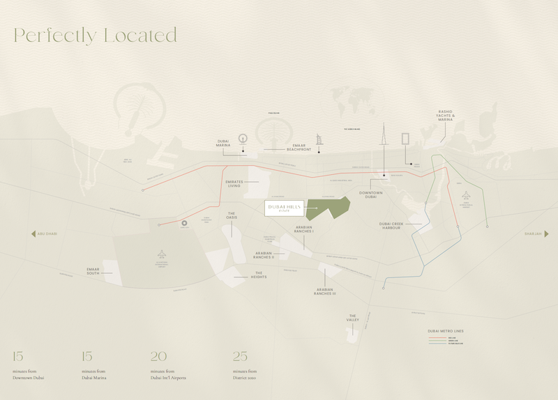 Dubai Hills(迪拜山庄)这个全能的生活社区坐落在迪拜市中心(Downtown Dubai)与迪拜港(Dubai Marina)之间,临近Al Khail Road,驾车即可轻松抵达迪拜市区内外任何一个闻名世界的街区与坐标地!