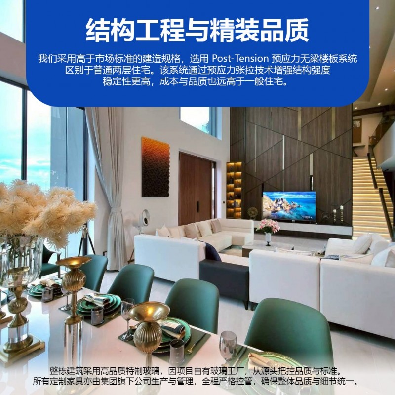 我们采用高于市场标准的建造规格,选用Post-Tension 预应力无梁楼板系统区别于普通两层住宅。