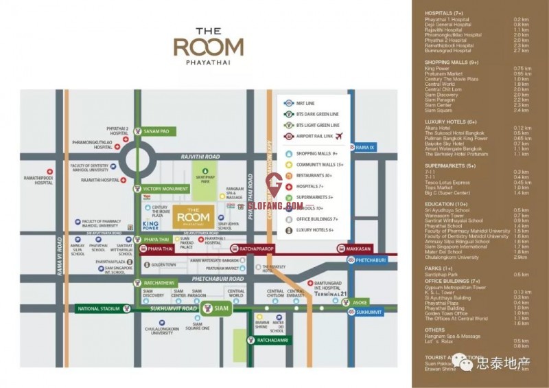 图上所示,披耶泰还是BTS与机场快线的交汇站点,同时北至曼谷地标建筑――胜利纪念碑;南通曼谷最时尚暹罗商圈,以及知名四面佛所在地;西距知名景点大皇宫约5公里;东面直达素万那普国际机场,BTS直达富人区蓬彭商圈(EM商场)。