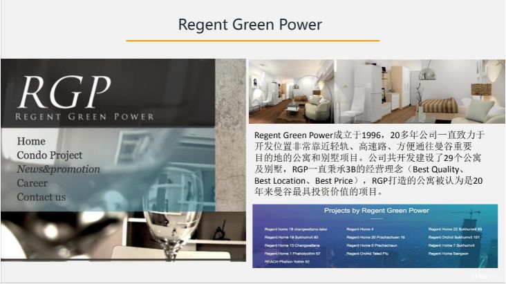 金融街公寓由泰国老牌房产商Regent Green Power开发建造,RGP是一家致力于开发核心为交通方便的公寓和别墅项目,RGP打造的公寓被认为是20年来曼谷最具投资价值的项目。