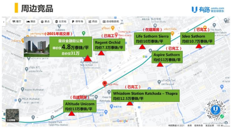 项目周围公寓项目比比皆是,但价格皆比本项目高,甚至贵出一倍的价格,距离项目420米的Whizdom Station Ratchada C Thapra总价就高达74.5万起,均价12.5万泰铢,足足贵了一倍之多,并且距离0米的Regent Orchid Talad Plu 均价也要7.3万泰铢起。