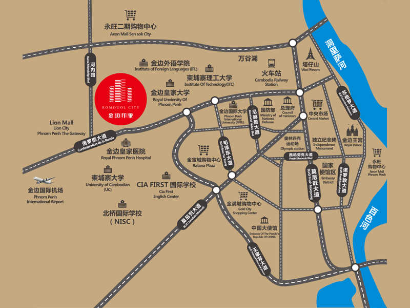 【金边印象】(ROMDUOL CITY)――中国明星房企“中民投旗下上置集团”实力钜献,180°全景观公寓 金街商铺,该项目位于柬埔寨金边市森速区俄罗斯大道北侧(金边皇家医院对面),地段优越,扼守金边交通主动脉,轻松连通城市各区。雄踞俄罗斯大道首都发展中轴,坐享金边皇家医院、金宝城、万客隆超市、永旺二期,以及超过20所国际名校城市级教育、医疗、商业稀缺资源,以国际化的视角、无可比拟的品质,打造首都生态国际人文社区,启幕金边2.0生活时代。