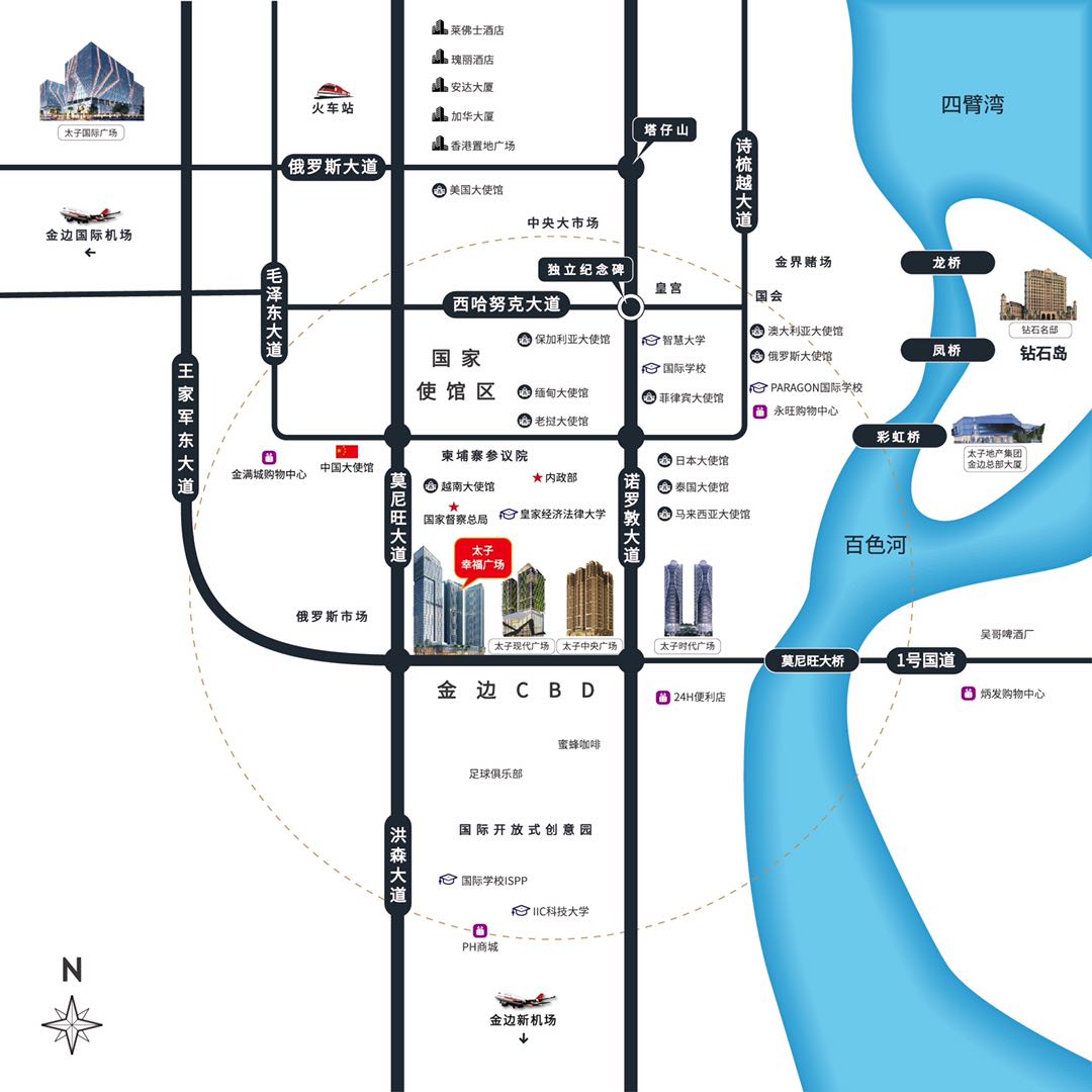 太子幸福广场,金边行政核心属地,国家级市政配套设施云集。生活半径内,坐拥第一综合医院、巴戎医院等业界领先医疗以及国际学校ISPP、PARAGON、皇家经济法律大学等国际名校资源。紧邻永旺3期、PH商城、俄罗斯市场、中央大市场等知名休闲购物场所,被索菲特酒店,百色河餐厅、金界娱乐城环抱,集医疗、教育、娱乐、商业、旅游等资源为一体,可全方位满足全球高端人士居住、商务、度假、娱乐等需求。