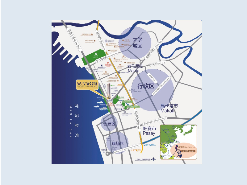 越来越多商业机构纷纷将办公室和卖场等商业空间搬至马尼拉湾区。菲航设总部于此处,美国、越南大使馆均设于此处。
