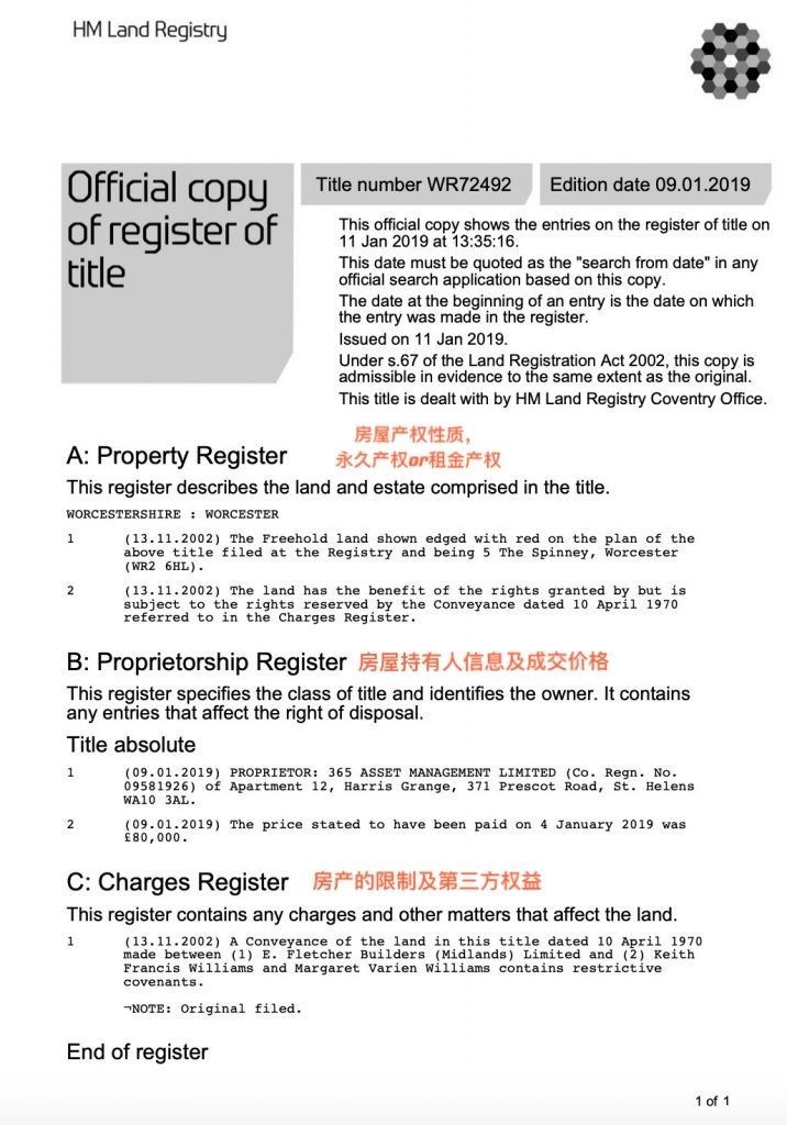 Title register,包含房屋产权、房主信息、具体地址、房产的限制(如是否有银行贷款)等信息。