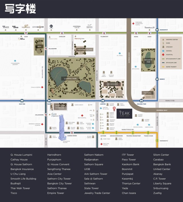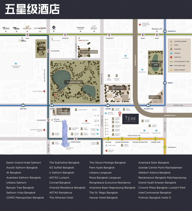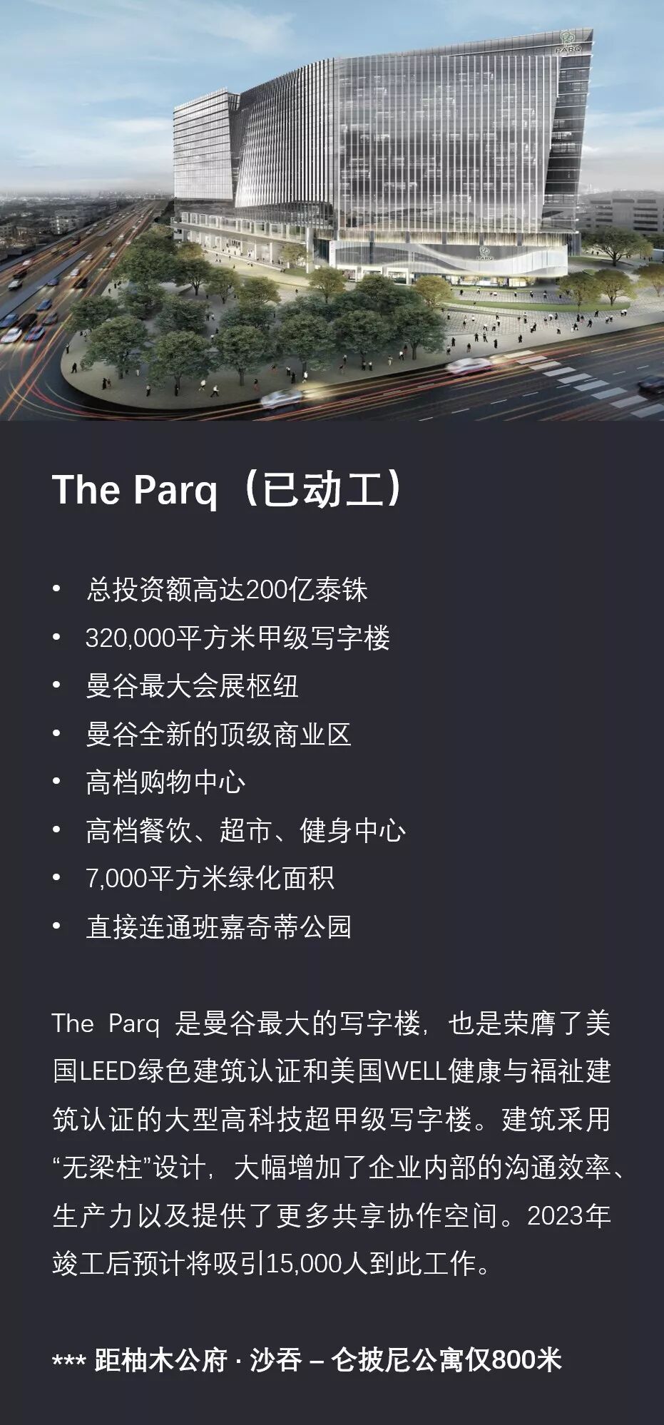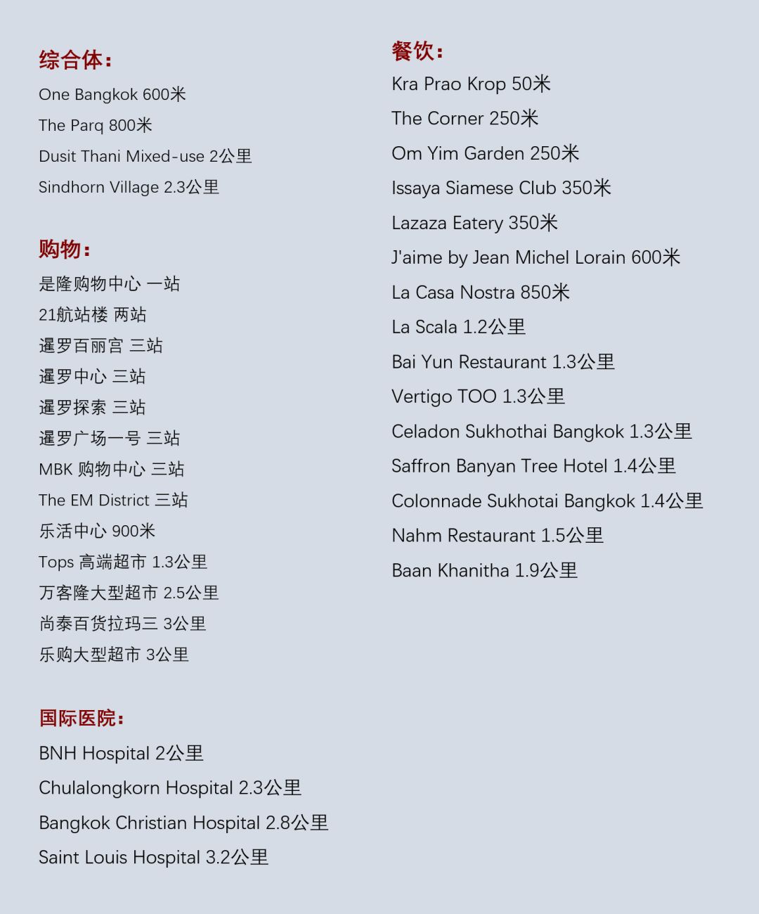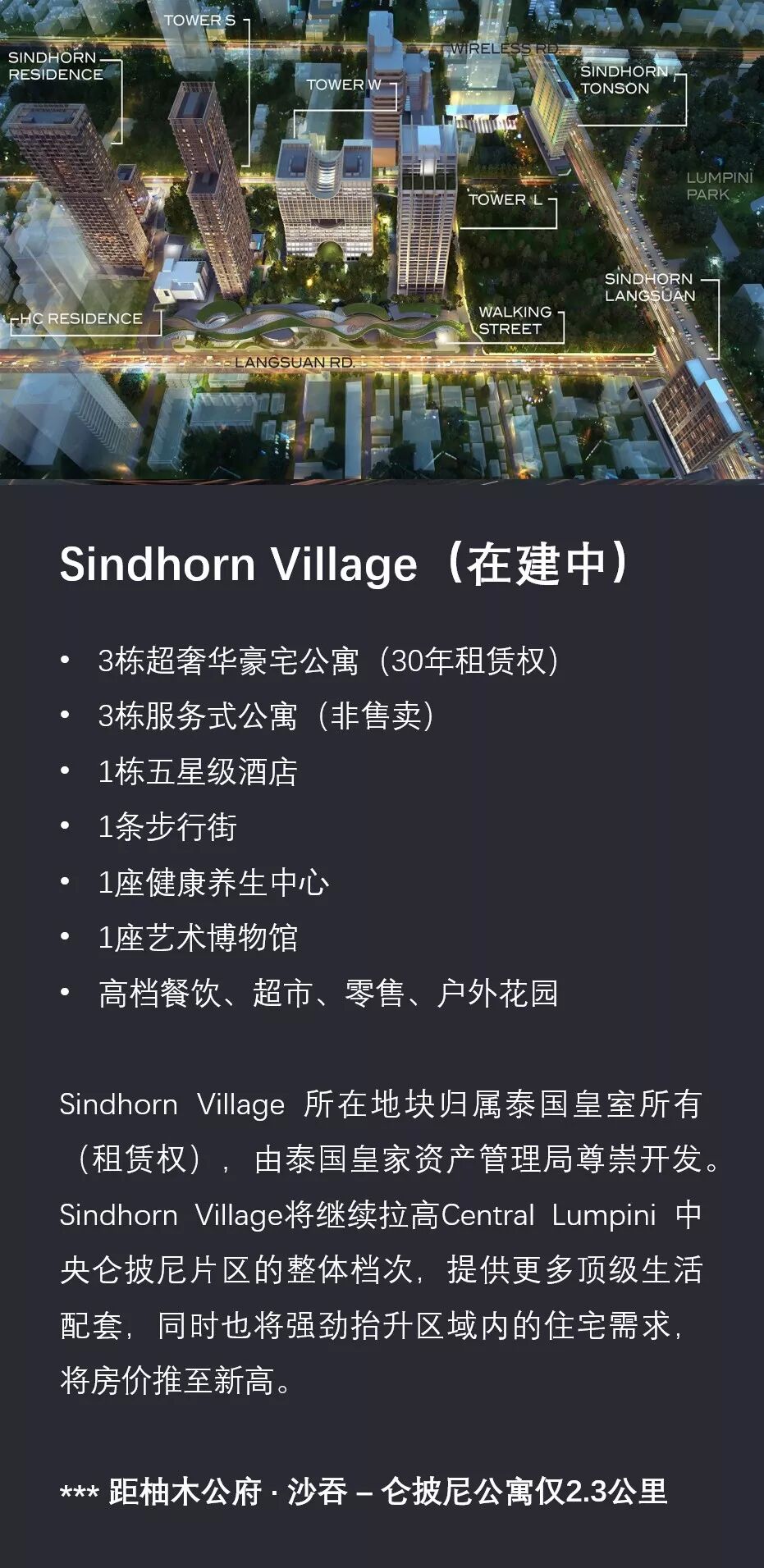 紧邻四座举世瞩目的超级综合体——泰国最大非政府投资项目One Bangkok 大型超奢华商业住宅综合体、曼谷最大写字楼The Parq 大型高科技超甲级写字楼综合体、泰国皇家资产管理局尊崇御造Sindhorn Village 大型高档住宅生活社区、都喜天丽集团与尚泰集团合资打造Dusit Thani Mixed-use 五星级标准多功能综合体