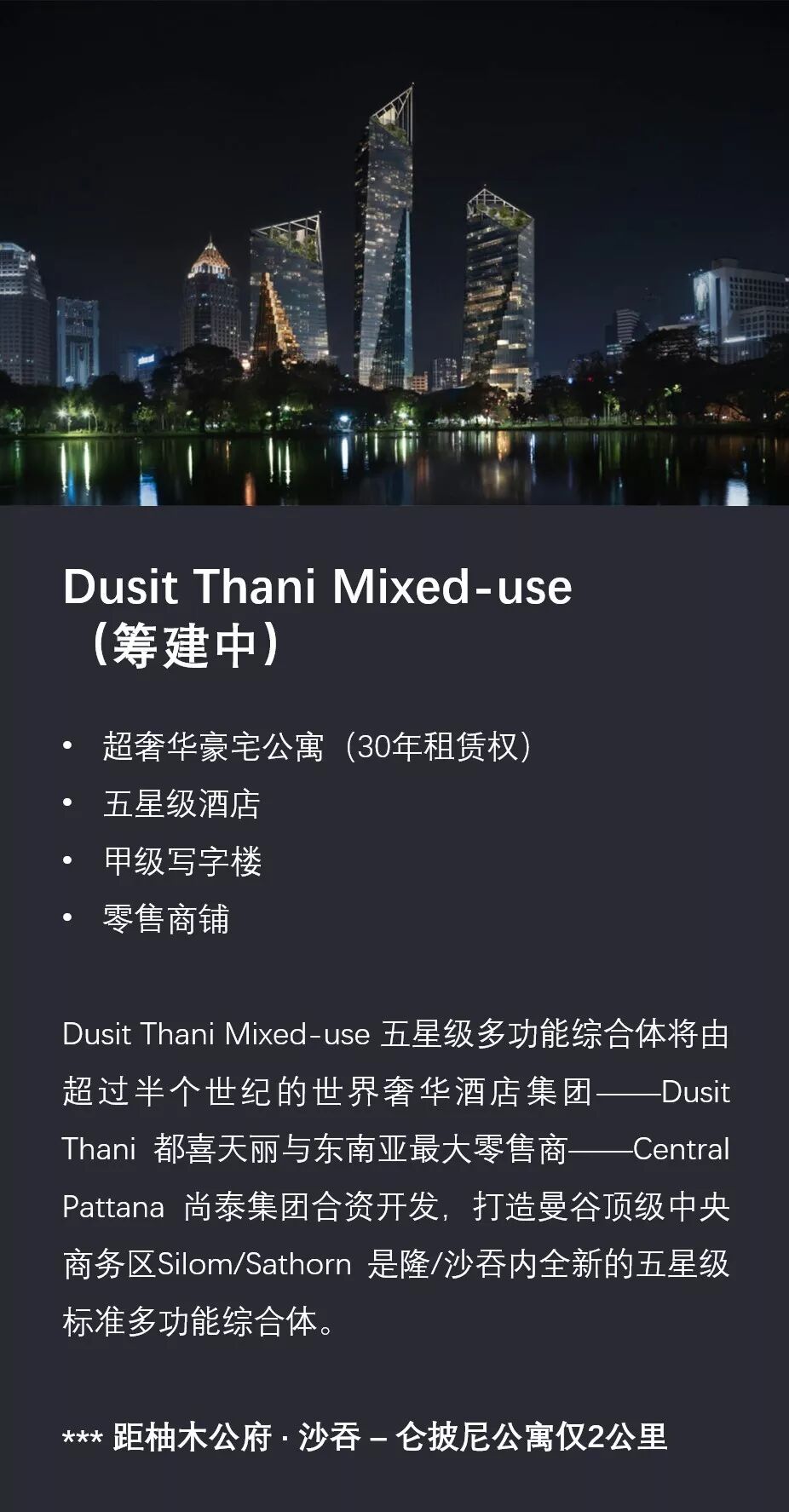 酒店、住宅、零售、写字楼——Dusit Thani Mixed-use 五星级标准综合体(2公里);
