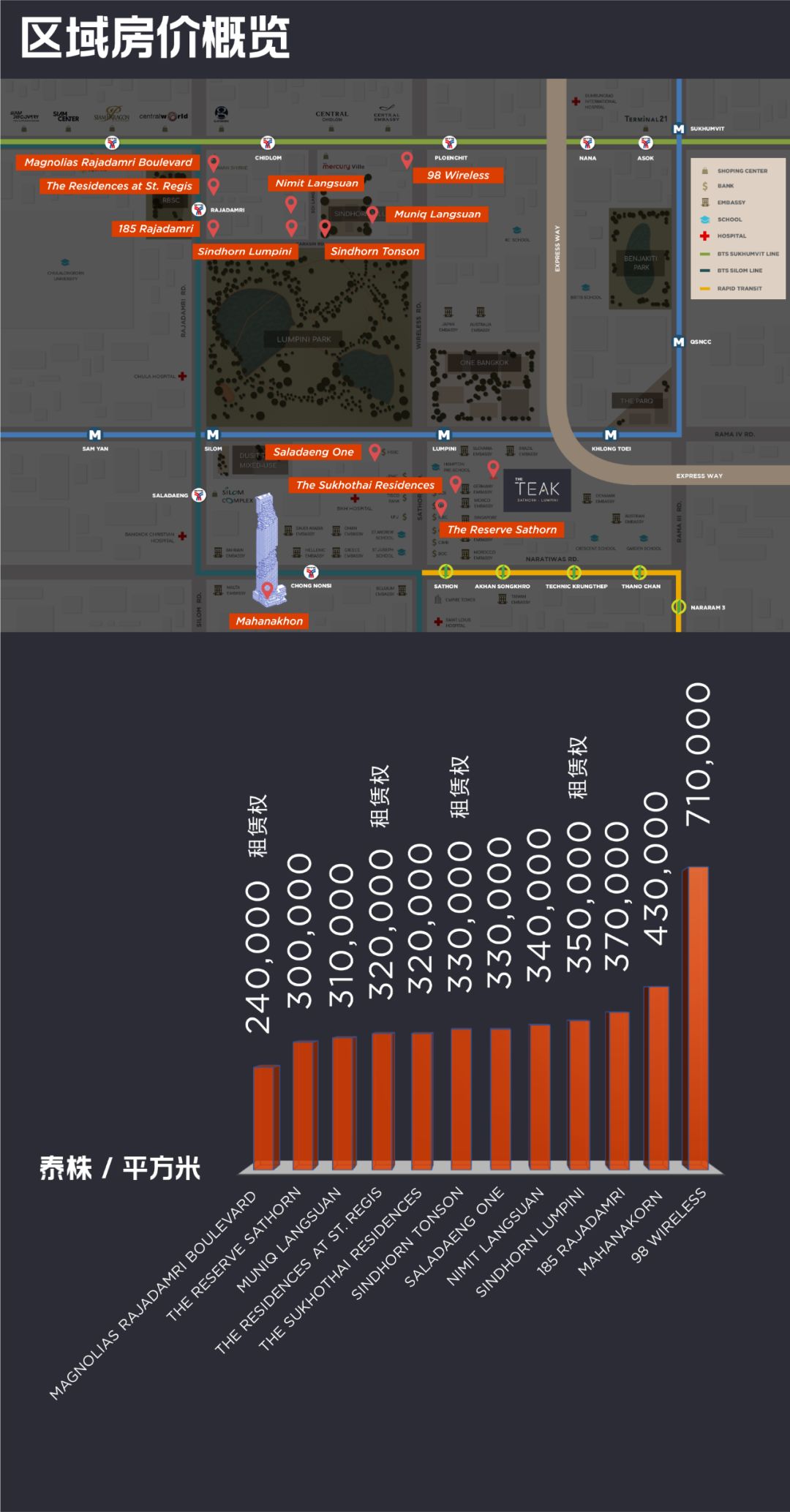 由于泰国皇室在Central Lumpini 中央伦披尼拥有巨幅土地,法律规定这些地块为租赁权(非永久产权),租期为30年至60年不等,因此这里的永久产权土地异常稀贵,成为了全曼谷房价最贵、顶级豪宅密集度最高的地段,共林立了12个大名鼎鼎的顶级豪宅,全东南亚最贵豪宅也坐落于此,新开盘的公寓也全都是Super Luxury(超奢华)档次,这里的房价也成为了曼谷公寓市场的标杆。
