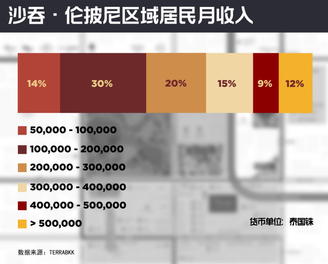 Sathorn 沙吞汇聚了超过14万名金融人士、商业专家、使馆工作人员以及高收入外派员工,他们为租赁市场提供了长期、稳定、强大的刚性需求。据调查,在此居住的人群月收入高达10万 ~ 50万泰铢,富裕的商务精英们撑起了Sathorn 沙吞稳步高涨的房价。
