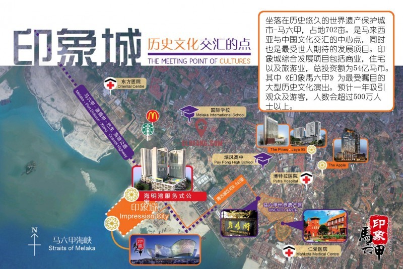 坐落在于马六甲历史城市,占地177英亩的印象城,将带来万众期待的《印象马六甲》演出,即世界著名的大型山水实景秀系列之一,是国与国文化族拥的核心点。拥有优越的地段和四通八达的出口,综合了发展包括购物广场, 公寓/酒店区, DIY区, 剧院区, 办公大楼/教育学院, 商业及旅游。印象城的总发展值为54亿马币。