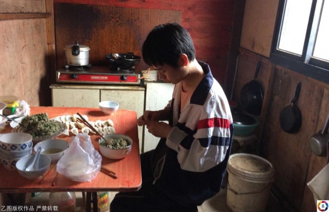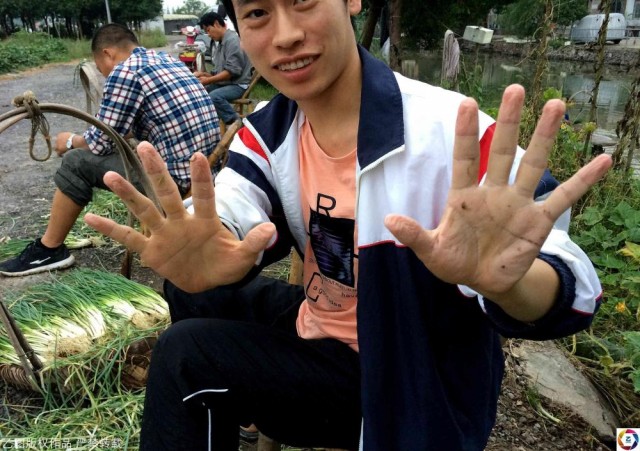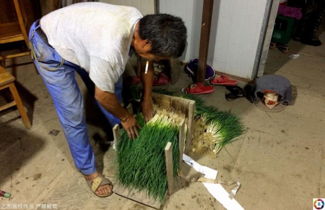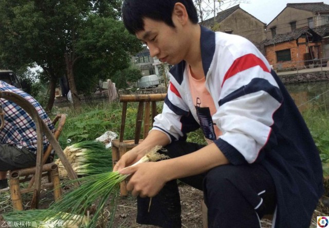 到家后,吴斌就开始摘葱。他和父亲从田里摘出葱,母亲和几个帮手便把枯萎的葱叶去除。吴斌虽然城里有房,父母平时却住在郊区的老房子里,方便种田。母亲虽只是个普通家庭妇女,却很重视吴斌的教育,宁肯苦点累点,也要资助吴斌去德国留学。为了省钱供孩子出国读书,父母总是凑合着过,这一凑合,就是大半辈子。图为吴斌高中的校服一直留到现在,穿着它干活。