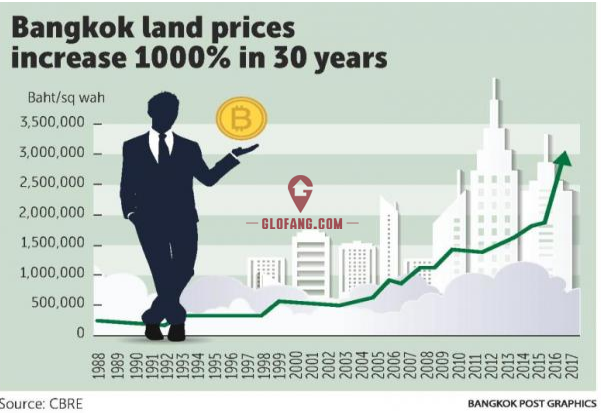 自1988年物业顾问CBRE在曼谷设立办事处以来,曼谷市中心的土地价格上涨了1000%。